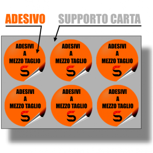 Gli adesivi verranno intagliati a mezzo taglio (vedi esempio su immagini) e consegnati su fogli in bobina.