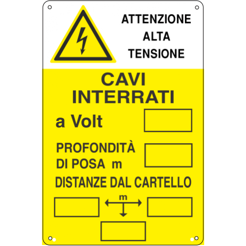 "attenzione alta tensione, cavi interrati, a volt …. profonditá di posa mt . …..distanze dal cartello mt. …."