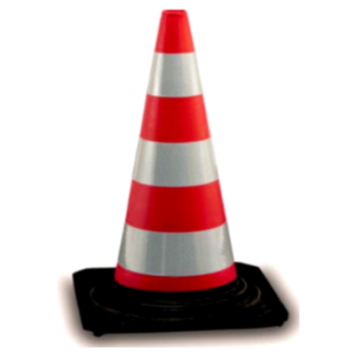 Cono stradale in gomma altezza cm 54 colore rosso, con tre fasce bianche ad alta rifrangenza in classe 2.