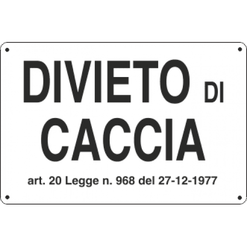 Cartello con segnalato "divieto di caccia, art. 20 Legge n. 968 del 27-12-1977" in alluminio stampato o in versione autoadesiva.
