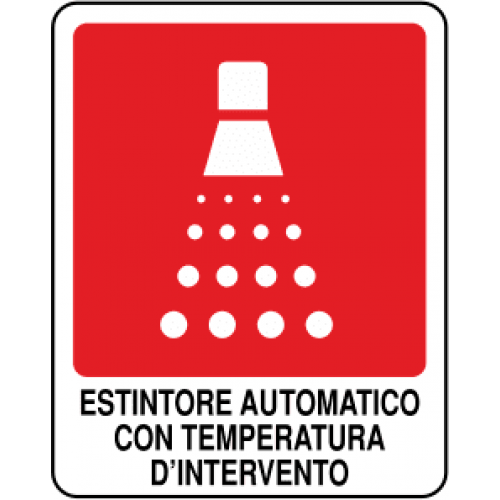 Segnale estintore automatico con temperatura d'intervento disponibile in alluminio stampato o in versione autoadesiva.
