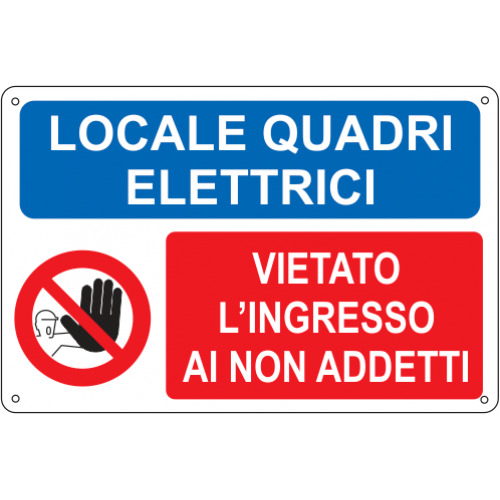 Segnaletica antinfortunistica multisimbolo con la seguenti simbologie e scritte "locale quadri elettrici, vietato l'accesso ai non addetti" disponibile in alluminio stampato o in versione autoadesiva.