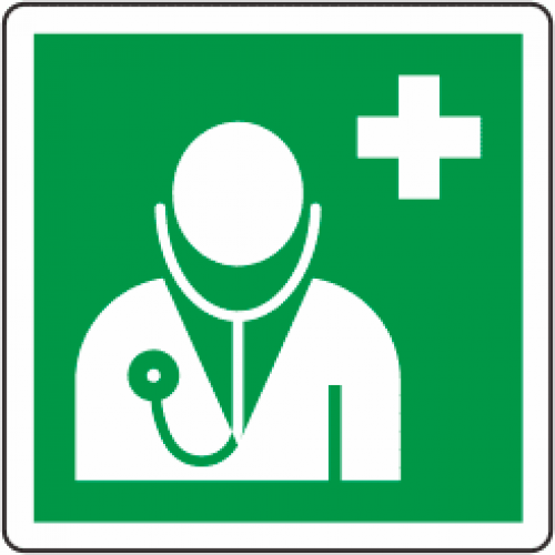 Segnaletica emergenza conforme UNI EN ISO 7010 con raffigurato "dottore" disponibile in alluminio stampato o in versione autoadesiva.